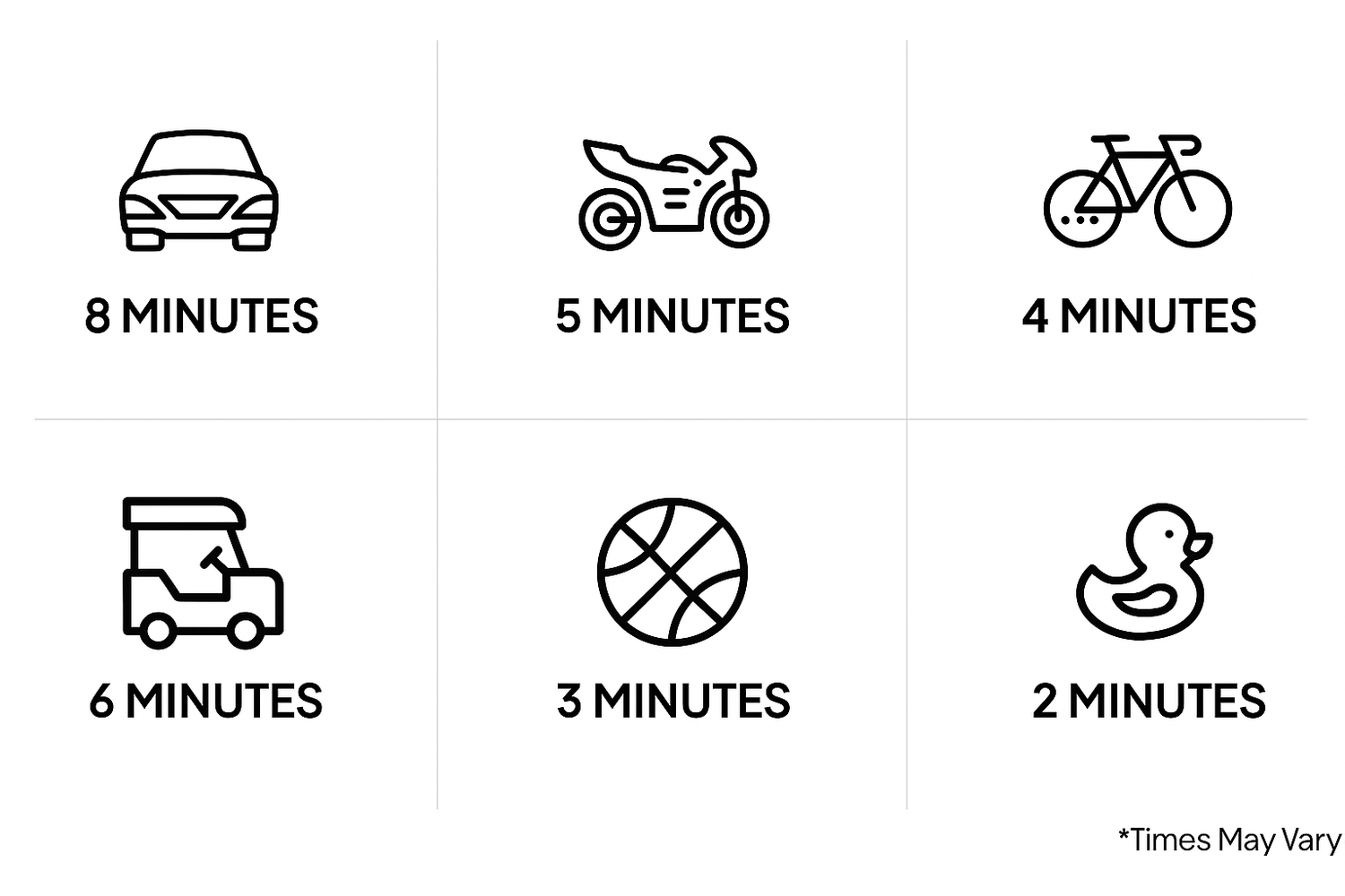 Bicycles and road bikes between 2-4 minutes. Motorcycle between 4-8 minutes. Average size car tire 4-10 minutes (low pressure) or 10-15 minutes (flat or nearly flat). Truck tires between 10-20 minutes. Basketballs and similar between 1-3 minutes.